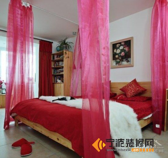 实木打造的床榻,大红色的床品配上白色长毛床搭,颜色十分出挑,桃红色的纱幔垂在四周,营造出一种极致的浪漫气息。