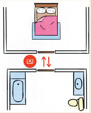 房间里的厕所对到床,情况比房门对到厕所严重,对到头,会头痛、思考时不能集中,住久了会产生肿瘤、中风等;对到腰,会腰酸、心脏无力、水肿,住久了会产生糖尿病、心脏病;对到脚,会坐骨酸痛、膝盖无力、痛风水肿,住久了会产生意外骨折。