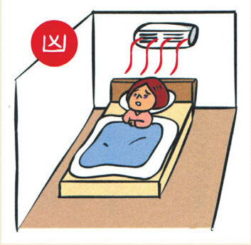 床位安置在空调下方,寒气不断吹向头、肩、颈,加上人在睡眠状态时,毛细孔会略微放开,轻者经常感冒,重者会造成头、肩、颈的神经紧张、肌肉僵化.