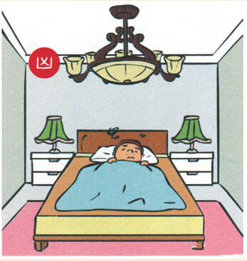 卧房的天花板,应简单为宜。千万别学商业空间,弄得非常艺术、奇特、花样百出,甚至装上镜子,这会使人不易入睡,久而久之健康会出问题。床位上方不可挂奇形怪状的灯具,会使人产生紧张不安的感觉。在地震频发的当今,床的正上方最好是完全没有任何灯具,卧室照明尽量使用床头桌灯或立灯及靠近墙边的隐藏灯管。